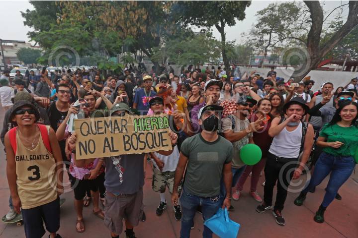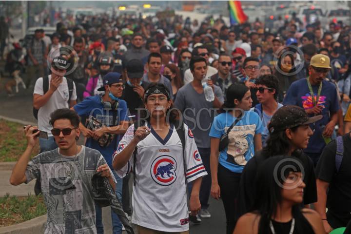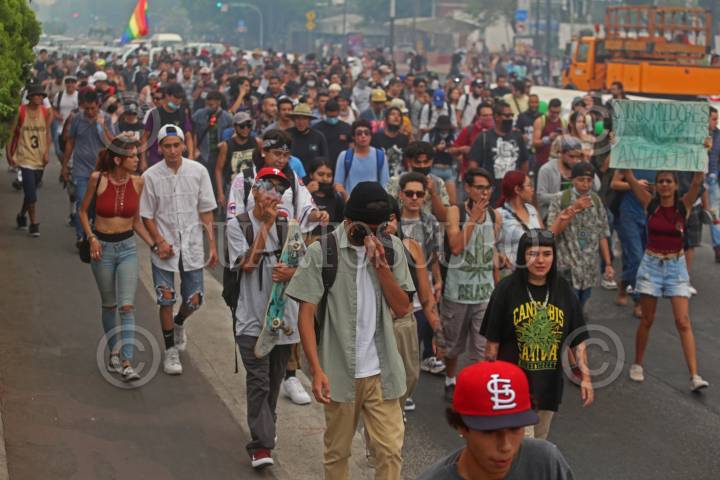 Decenas de personas a favor del uso recreativo y medicinal de la marihuana, marchan hacia el centro de la ciudad en la séptima marcha mundial por la liberación de la marihuana.