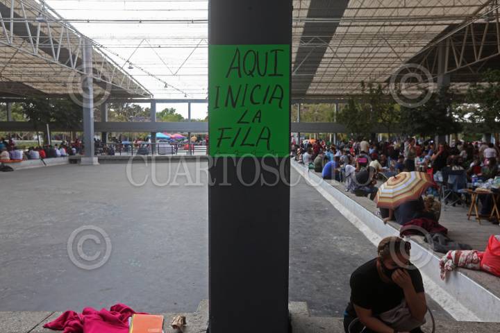 Algunas personas se previnieron con toldos para el sol y sillas mientras hacen fila en el Parque San Jacinto, uno de los módulos donde el día de mañana se estará aplicando la vacuna contra el Covid-19.