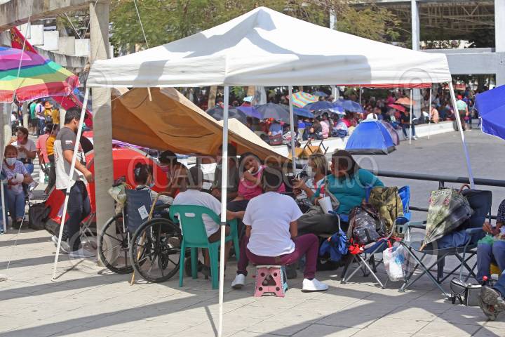 Algunas personas se previnieron con toldos para el sol, sillas y casas de campaña para dormir mientras hacen fila en el Parque San Jacinto, uno de los módulos donde el día de mañana se estará aplicando la vacuna contra el Covid-19.