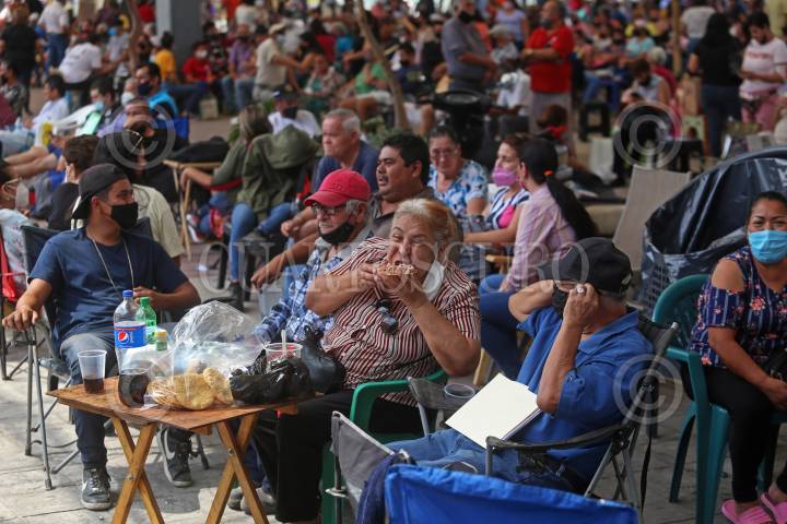 Algunas personas se previnieron con alimentos mientras hacen fila en el Parque San Jacinto, uno de los módulos de vacunación en Guadalajara, donde el día de mañana se estará aplicando la inmunización contra el Covid-19.