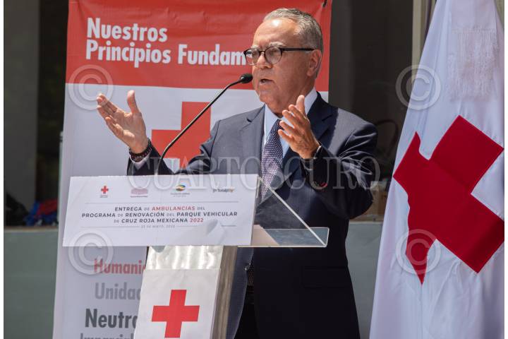 El presidente nacional de la Cruz Roja Mexicana Carlos Freaner Figueroa durante la ceremonia de entrega de nuevas ambulancias para la Cruz Roja Mexicana, esto como parte de la renovación del parque vehicular.