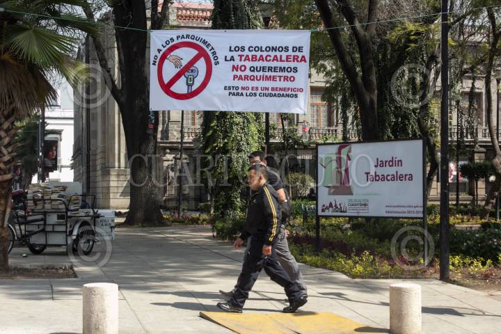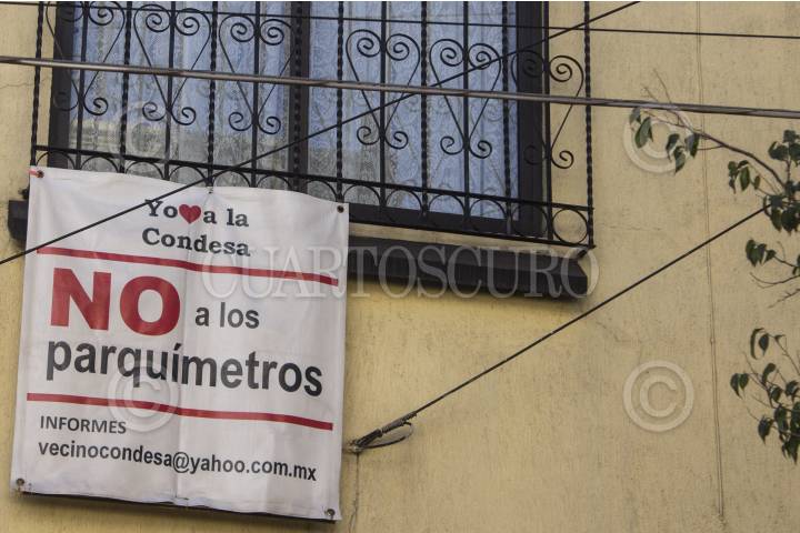 MÉXICO, D.F., 27DICIEMBRE2012.- Algunos vecinos de la colonia Condesa en la Ciudad, colocaron una serie de lonas y mantas donde manifiestan su desacuerdo a la colocación de parquímetros ya que se pretende hacer una encuesta para entrar en vigor el funcionamientos de los mismos. FOTO: ENRIQUE ORDÓÑEZ /CUARTOSCURO.COM