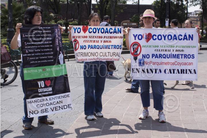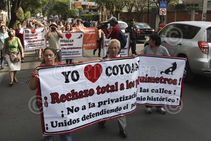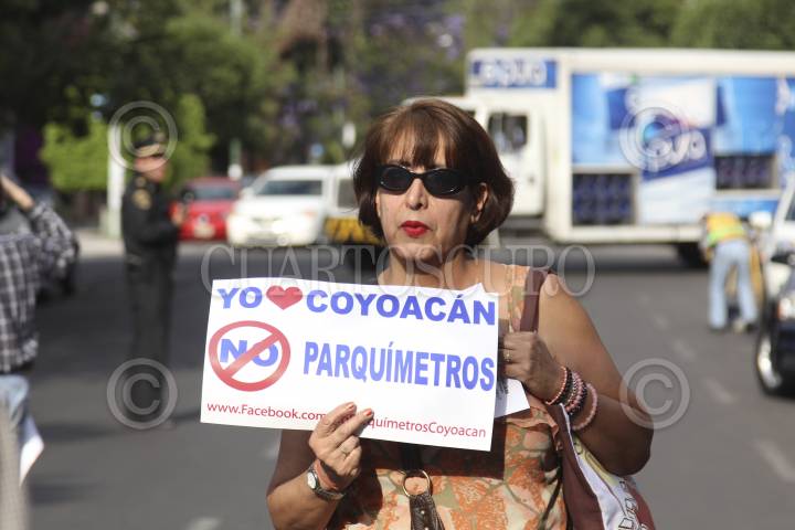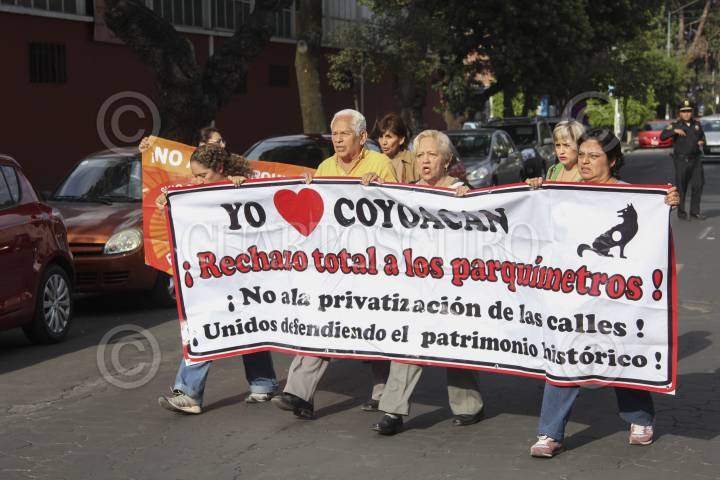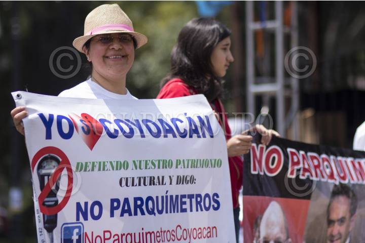 MÉXICO, D.F., 10AGOSTO2014.- Vecinos de Coyoacán se dieron cita hoy en el Jardín Hidalgo de dicha demarcación para protestar en contra de la instalación de parquímetros en sus colonias. Acusan al gobierno de estar coludido con las empresas que tienen las concesiones para operar los parquímetros en la zona y de no cumplir con su palabra de realizar una consulta popular para conocer la opinión de los habitantes acerca de este tema. FOTO: DAVID POLO /CUARTOSCURO.COM