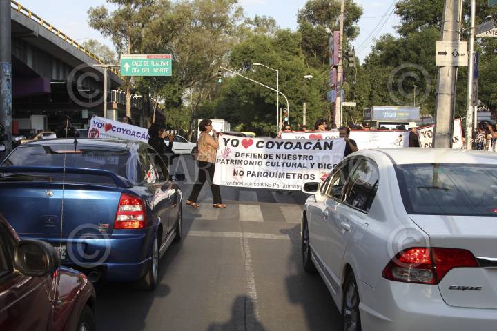 MÉXICO, D.F., 11ABRIL2014.- Alrededor de 100 vecinos del Centro de Coyoacán bloquean todos los carriles de Avenida Centenario, al cruce con Río Churubusco, para impedir que el Gobierno capitalino coloque parquímetros en sus calles. Una vecina de la Colonia El Carmen, dijo que la protesta tiene por objetivo que las autoridades se acerquen para entablar una negociación en la que garanticen una consulta vecinal vinculatoria. FOTO: SAÚL LÓPEZ /CUARTOSCURO.COM
