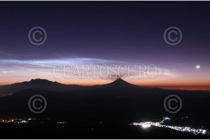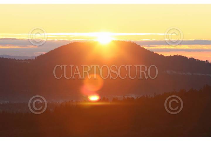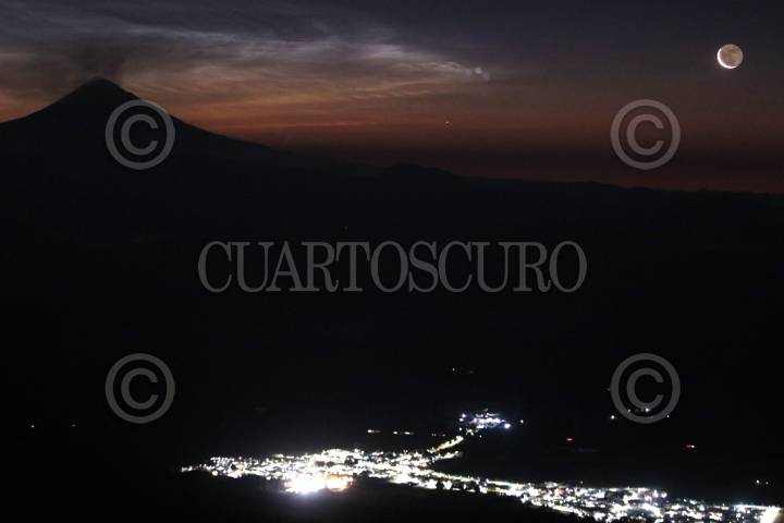 Amanecer desde la cima del volcán El Pelado, a la izquierda el Popocatépetl, a la derecha la luna en su fase menguante, abajo el poblado de Parres, en la alcaldía de Tlalpan.