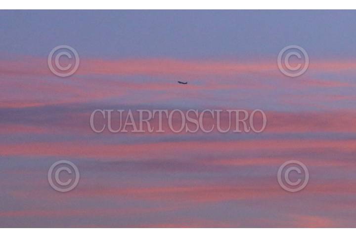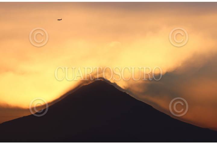 Un avión vuela sobre el Popocatépetl durante el amanecer de este día.