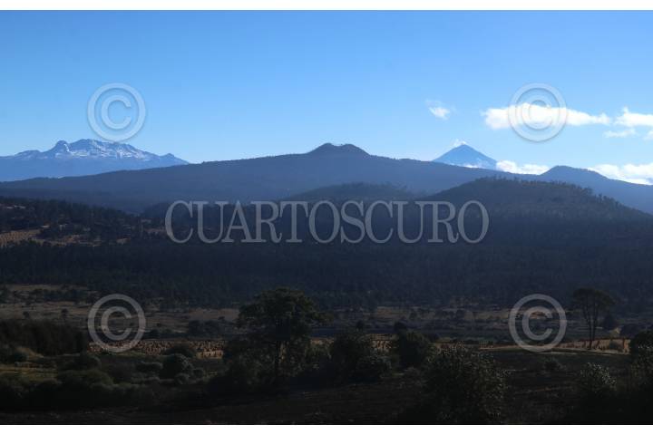 CIUDAD DE MÉXICO, 29DICIEMBRE2023.- Los volcanes Iztaccíhuatl, Tlaloc, Popocatépetl, la Comalera y el Ocotecatl durante la mañana de este día, imagen tomada desde el cráter del volcán inactivo Acopiaxco, ubicado en las cercanías de la población de Parres el Guarda, en la delegación Tlalpan. Al sur de la capital del país, en la colindancia con el estado de Morelos y el Estado de México se encuentra el Campo Volcánico Chichinautzin constituido por más de 120 volcanes monogenéticos (conos de escoria, derrames de lava fisúrales, domos y volcanes en escudo), dentro de un área de 2680 km2. FOTO: MARGARITO PÉREZ RETANA /CUARTOSCURO.COM