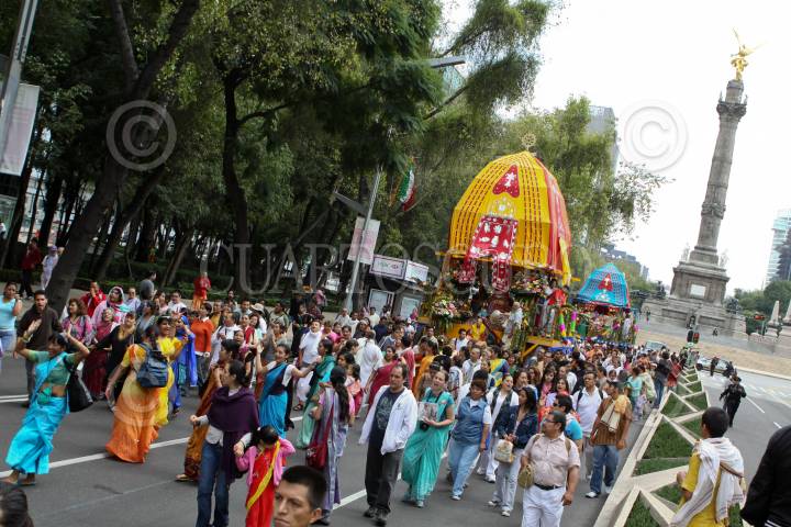 MÉXICO, D.F., 25SEPTIEMBRE2010.- Miembros de la comunidad Krishna cantan y bailan Mantras acompañados por sus deidades en una procesión que partio de la glorieta del Angel de la Independencia hacia el Parque España en donde celebraron un festival. FOTO: RODOLFO ANGULO/CUARTOSCURO.COM