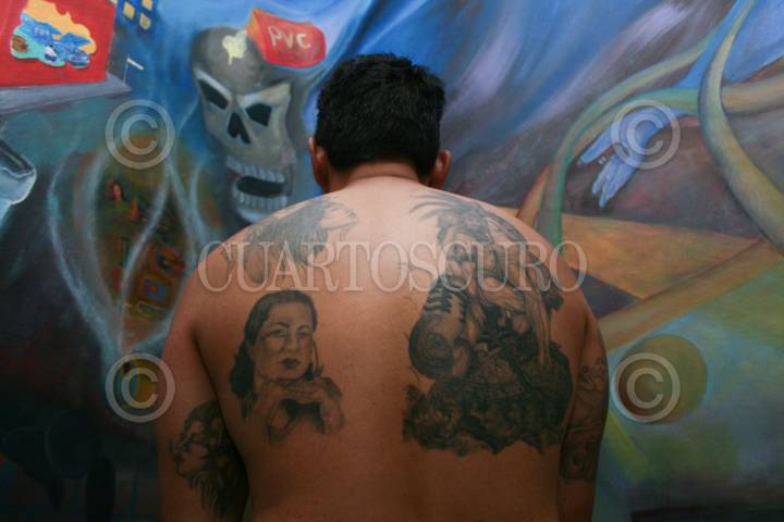 MÉXICO, D.F., 18ABRIL2008.- Un Interno del Penal de Santa Martha Acatitla Muestra sus tatuajes, al fondo se observa un mural en el que varios internos participaron. FOTO: SÁSHENKA/CUARTOSCURO.COM