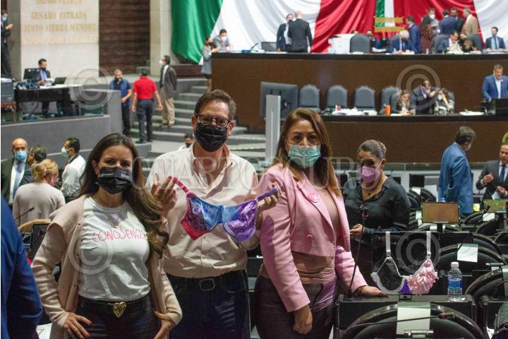 Mirza Flores, Salomón Chertorivsky, y Leticia Chávez, diputados de Movimiento Ciudadano, muestran un brasier por la campaña de una organización social que lucha en contra del cáncer de mama.