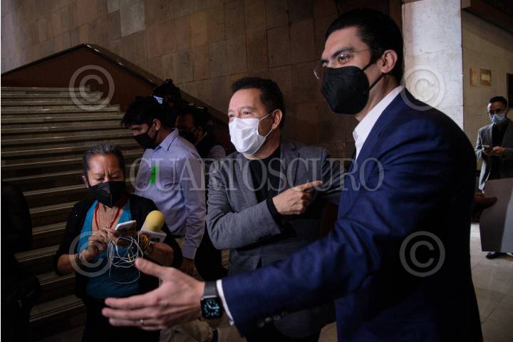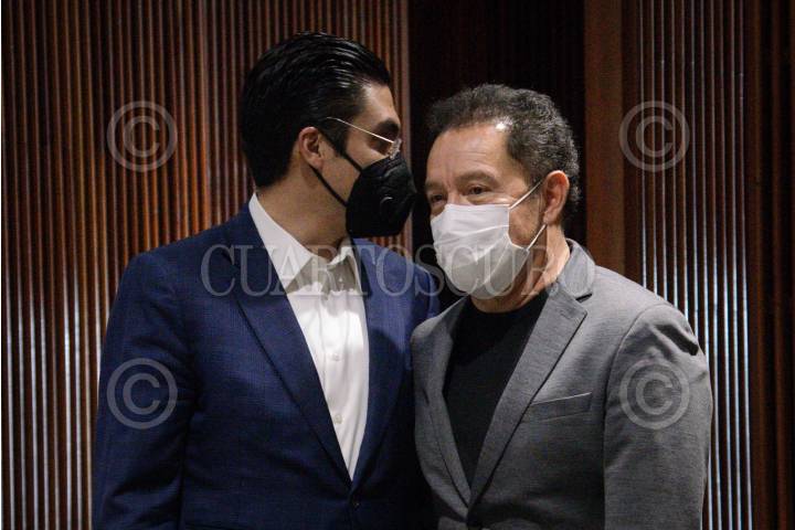 Lo coordinadores parlamentarios: Juan Carlos Romero (PAN) e Ignacio Mier (Morena) se reúnen durante la reanudación de la sesión ordinaria de la Cámara de Diputados en la que continúa la discusión de las reservas de la miscelánea fiscal 2022.