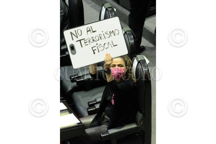 Mariana Gómez del Campo, diputada del PAN, muestra una pizarra con la frase “No al terrorismo fiscal” durante la sesión ordinaria de la Cámara de Diputados.