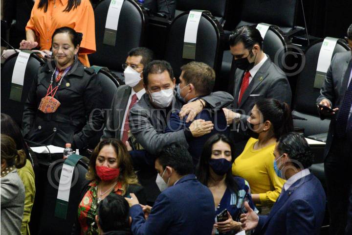 Ignacio Mier, diputado de Morena, abraza a Javier López Casarin, diputado del PVEM, durante la aprobación en lo general y en lo particular el proyecto de Decreto que reforma, adiciona y deroga diversas disposiciones de la Ley del Impuesto sobre la Renta, de la Ley del Impuesto al Valor Agregado, de la Ley del Impuesto sobre Producción y Servicios, de la Ley Federal del Impuesto sobre Automóviles Nuevos, del Código Fiscal de la Federación y otros ordenamientos.