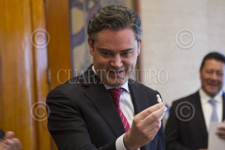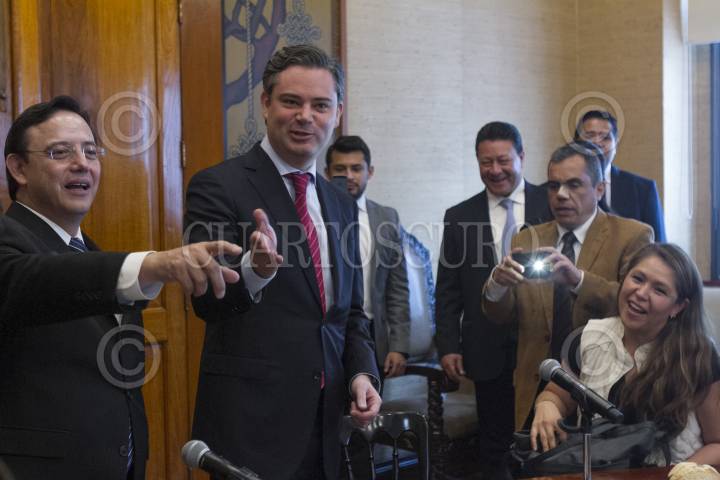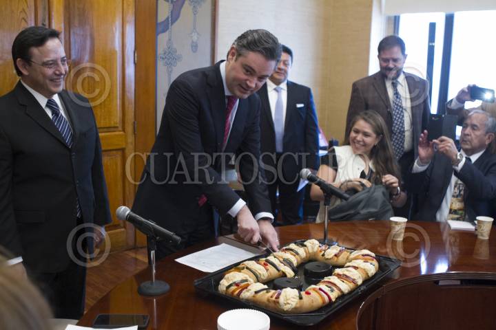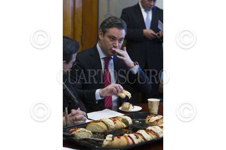 MÉXICO, D.F., 06ENERO2016.- Aurelio Nuño, secretario de Educación Pública, partió la rocas de reyes con los reporteros de la fuente, el político se sacó el muñequito por lo que prometió los tamales para el Día de la Candelaria. FOTO: MOISÉS PABLO /CUARTOSCURO.COM