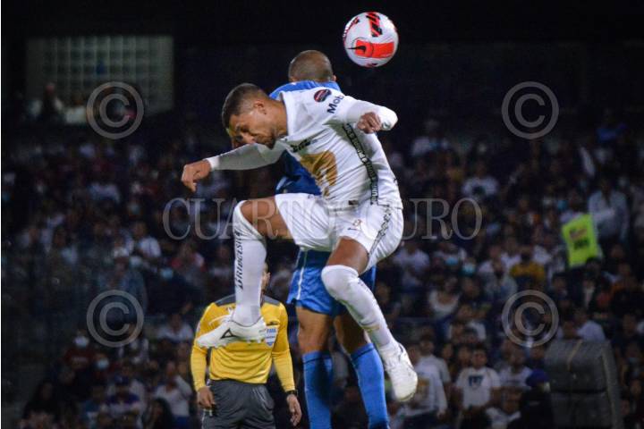 Higor Meritao, mediocampista de los Pumas, y Rafael Baca, mediocampista del Cruz Azul, disputan en el aire el balón, en partido de ida de las semifinales de la Liga de Campeones Concacaf "Concachampions" 2022.