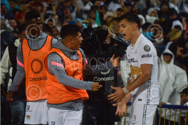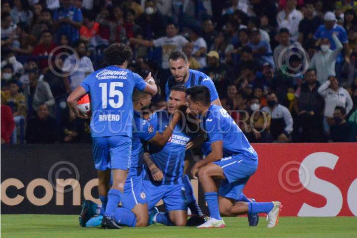 Christian Tabó, mediocampista del Cruz Azul, festeja con sus compañeros la anotación que hizo frente a los Pumas, en partido de ida de las semifinales de la Liga de Campeones Concacaf "Concachampions" 2022.