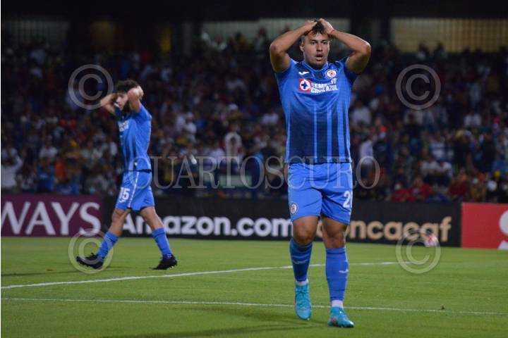 Iván Morales, delantero del Cruz Azul, y José Rivero, mediocampista del Cruz Azul, lamentan no haber concretado una oportunidad clara de gol frente a los Pumas, en partido de ida de las semifinales de la Liga de Campeones Concacaf "Concachampions" 2022.