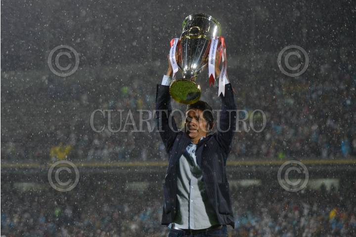 Jorge Campos, ex portero de los Pumas, carga el trofeo de la Liga de Campeones Concacaf "Concachampions" 2022.