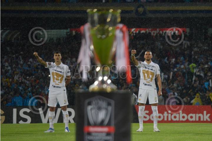 Juan Dinenno, delantero de los Pumas, y Nicolás Freire, defensa de los Pumas, entonan el himno universitario previo al encuentro contra Sounders de Seattle, en partido de ida de la final de la Liga de Campeones Concacaf "Concachampions" 2022.