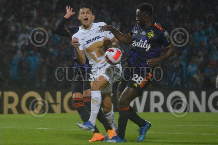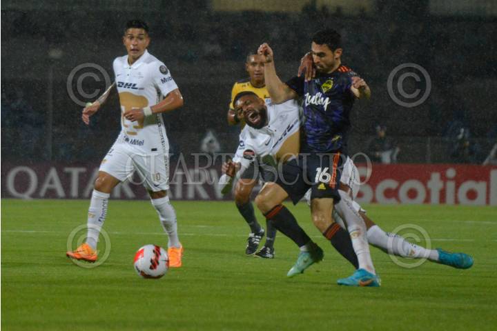 Los defensivos de Sounders: Xavier Arreaga, y Yeimar Gómez, cometen penal a Juan Dinneno, delantero de los Pumas, en partido de ida de la final de la Liga de Campeones Concacaf "Concachampions" 2022.