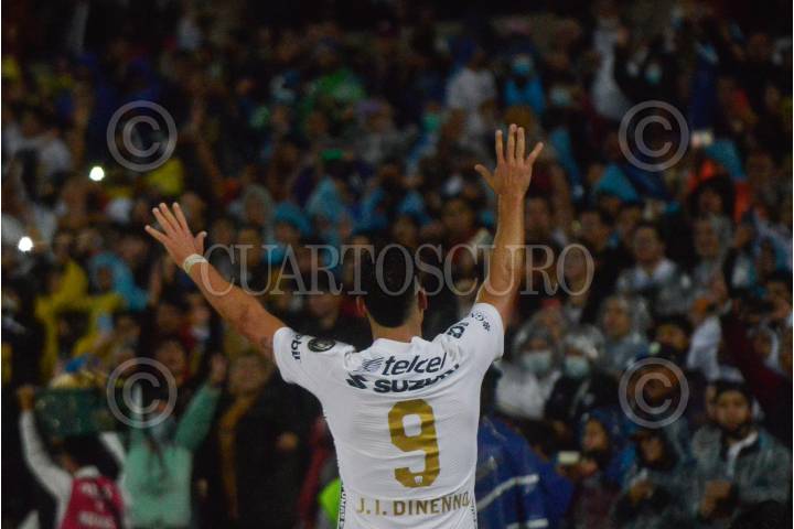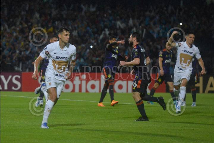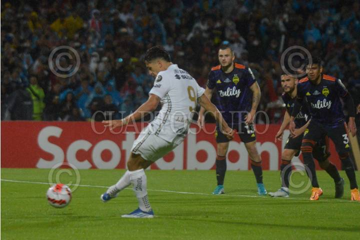 Juan Dinenno, delantero de los Pumas, remata el balón para anotar a Sounders de Seattle, en partido de ida de la final de la Liga de Campeones Concacaf "Concachampions" 2022.