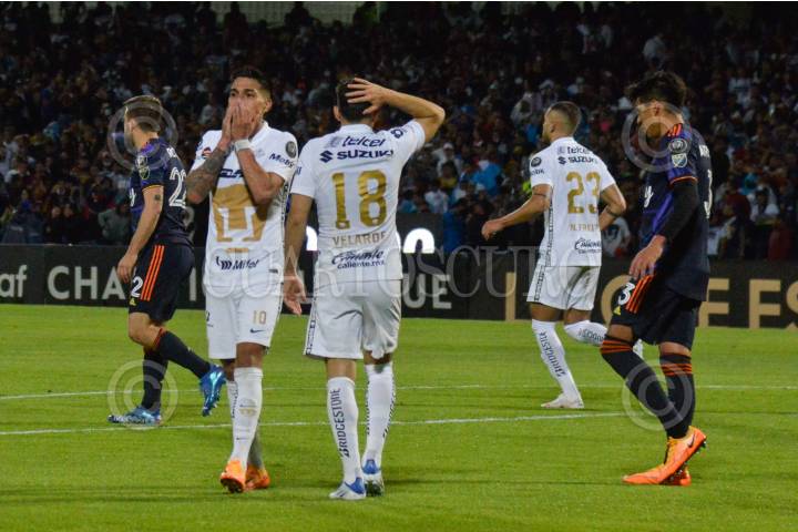 Favio Álvarez, mediocampista de los Pumas, y Efraín Velarde, defensa de los Pumas, lamentan el empate 2 a 2 frente a Sounders.