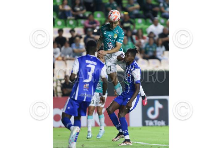 Víctor Dávila, delantero del León, remata un balón en el área chica, durante el encuentro contra el Violette AC de Haití, partido de ida de los cuartos de final de la Liga de Campeones Concacaf 2023.