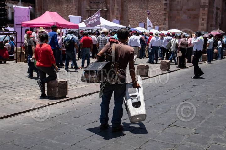 Un bolero observa un mitin proselitista en donde Adán Augusto López, ex secretario de Gobernación y precandidato para coordinar la 4ta Transformación por el partido Morena a la presidencia de la República, realiza una “visita informativa” en la Plaza de Armas de la capital zacatecana.