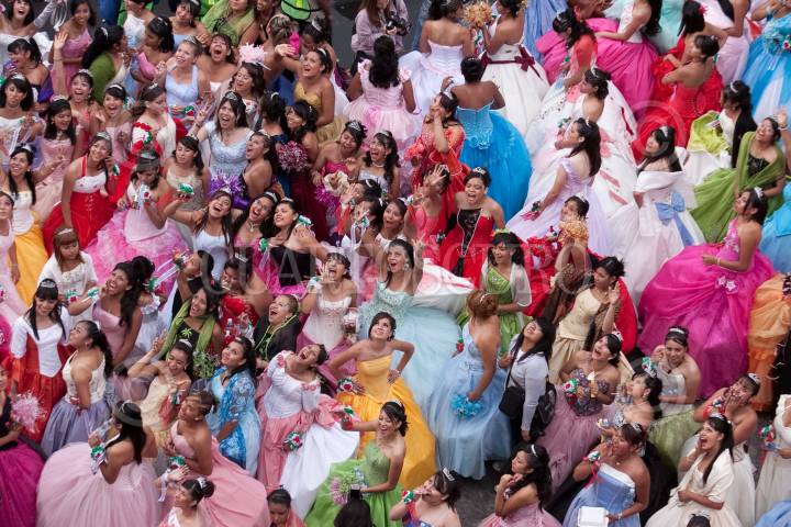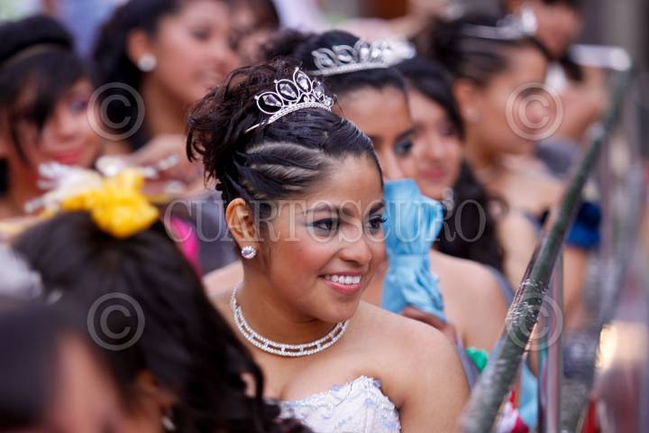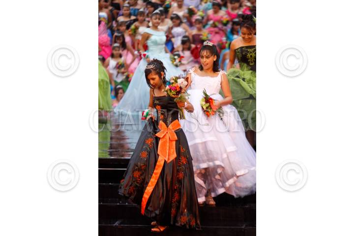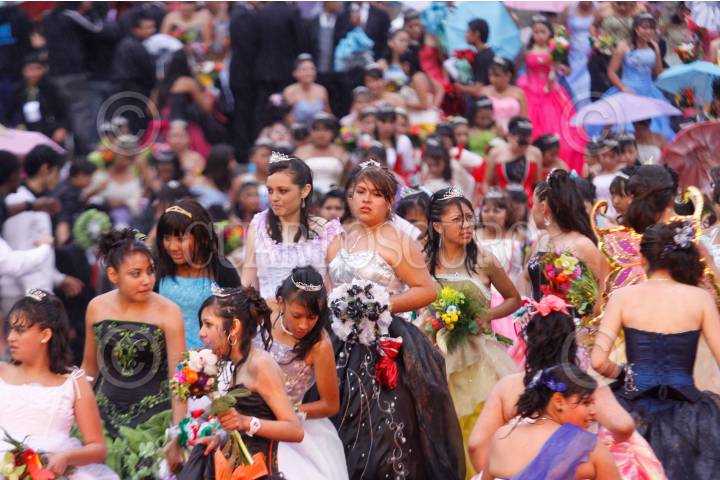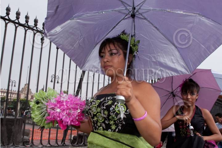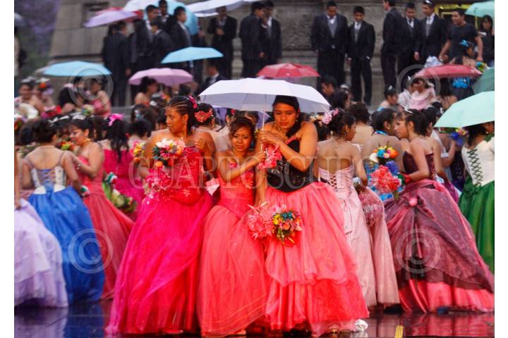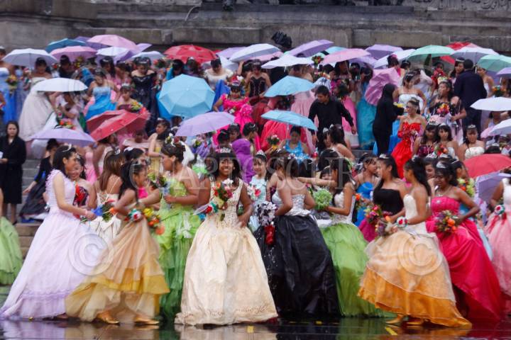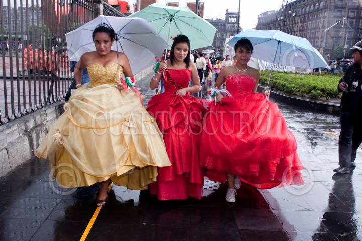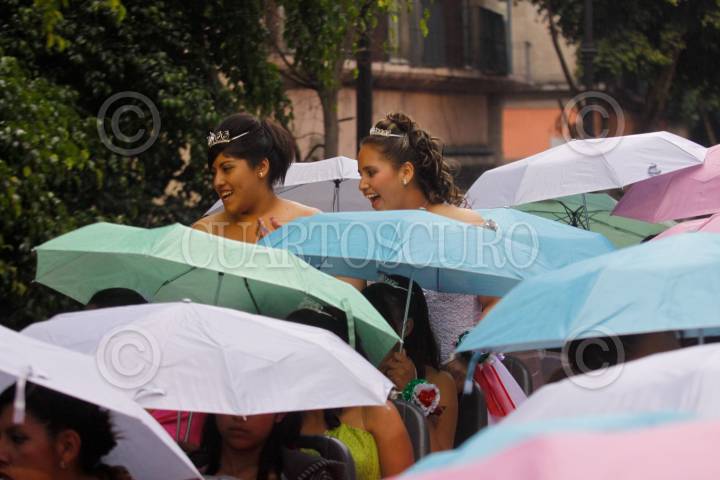 MÉXICO, D.F., 17ABRIL2010.- Más de 350 Quinceañeras partieron del Instituto de la Juventud al Zocalo Capitalino dara incio a su celebración de XV años por motivo del programa "Quinceañeras del Bicentenario: Por tus Derechos de Juventud" en donde a pesar de la intensa lluvia bailaron el vals en la glorieta del Ángel de la Independencia. FOTO: RODOLFO ANGULO/CUARTOSCURO.COM