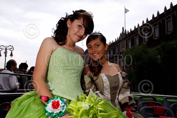 MÉXICO, D.F., 17ABRIL2010.- Más de 350 Quinceañeras partieron del Zocalo Capitalino a la glorieta del Ángel de la Independencia a bordo de turibuses en donde celebraron sus XV años por motivo del programa "Quinceañeras del Bicentenario: Por tus Derechos de Juventud" en donde a pesar de la intensa lluvia bailaron el vals en la glorieta del Ángel de la Independencia. FOTO: RODOLFO ANGULO/CUARTOSCURO.COM