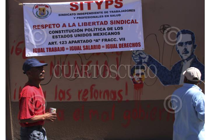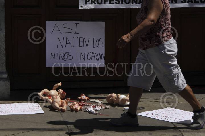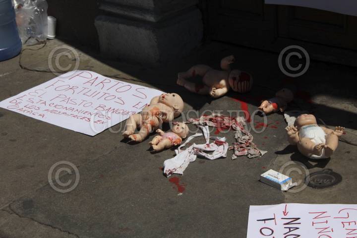 OAXACA, OAXACA, 18FEBRERO2014.- Empleados del Sindicato Independiente de Trabajadores y Profesionales en Salud protestaron este día en contra del secretario de Salud, Germán Tenorio Vasconcelos por los malos manejos que ha tenido de la dependencia estatal. Durante la manifestación arrojaron en la banqueta muñecos y aseveraron "así es como nacen los bebes en Oaxaca". FOTO: ARTURO PÉREZ ALFONSO /CUARTOSCURO.COM