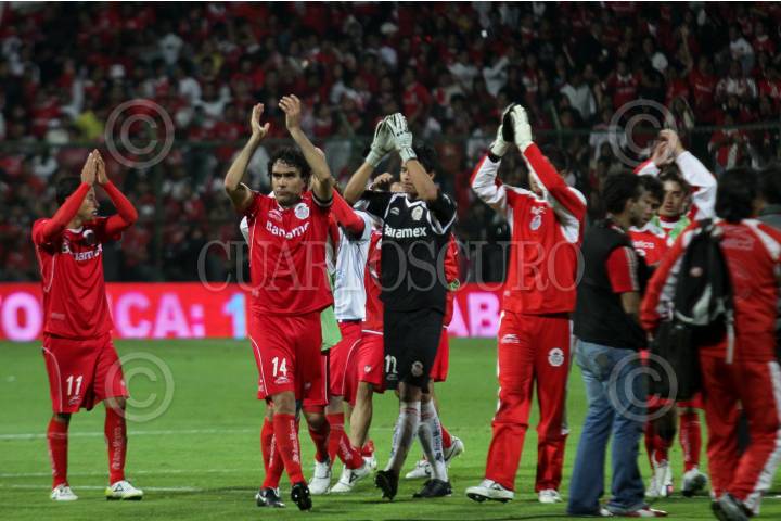 TOLUCA, ESTADO DE MÉXICO, 15MAYO2010.- Jugadores de los Diablos del Toluca agracecen a su afición al termino del encuentro en contra de los Tuzos del Pachuca en el partido de vuelta de las semifinales del torneo Bicentenario del fútbol mexicano que se realizo en el estadio Nemesio Diez ganando los Diablos del Toluca 1 gol por 0 pasando así a la gran final. FOTO: RODOLFO ANGULO/CUARTOSCURO.COM