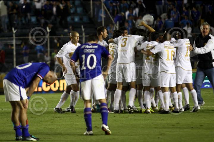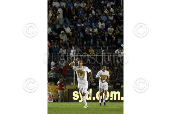 MÉXICO, D.F., 20NOVIEMBRE2010.- Juan Carlos Cacho de los Pumas de la UNAM celebra su anotación en contra de la Maquina Celeste del Cruz Azul durante el encuentro que se realizo en el Estadio Azul; partido de cuartos de final que ganó Pumas 2 goles por 0 pasando así a semifinales. FOTO: RODOLFO ANGULO/CUARTOSCURO.COM