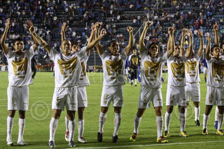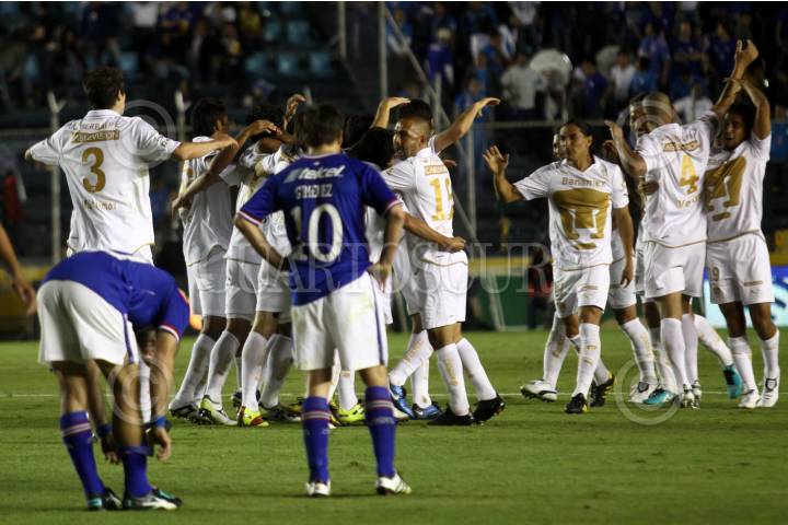MÉXICO, D.F., 20NOVIEMBRE2010.- Jugadores de los Pumas de la UNAM celebran su victoria en contra de la Maquina Celeste del Cruz Azul al termino del encuentro que se realizo en el Estadio Azul; partido de cuartos de final que ganó Pumas 2 goles por 0 pasando así a semifinales. FOTO: RODOLFO ANGULO/CUARTOSCURO.COM