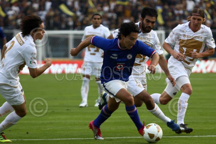 MÉXICO, D.F., 20NOVIEMBRE2010.- Cesar Villaluz de la Maquina Celeste del Cruz Azul pelea el balón durante el partido de vuelta en contra de los Pumas de la UNAM que se realizo en el Estadio Azul; partido de cuartos de final que ganó Pumas 2 goles por 0 pasando así a semifinales. FOTO: RODOLFO ANGULO/CUARTOSCURO.COM