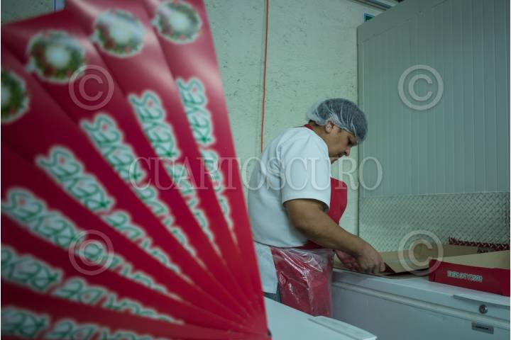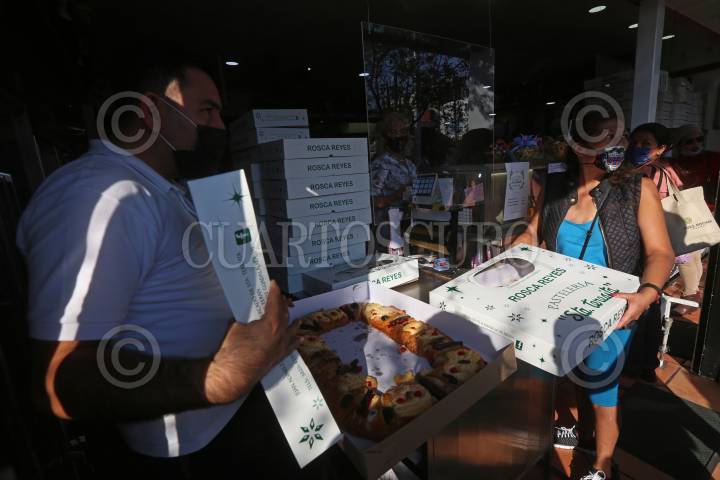Un trabajador de la Pastelería Santa Teresita, muestra una rosca de reyes a una cliente que quiere ver el producto, esto en el marco del día de reyes.