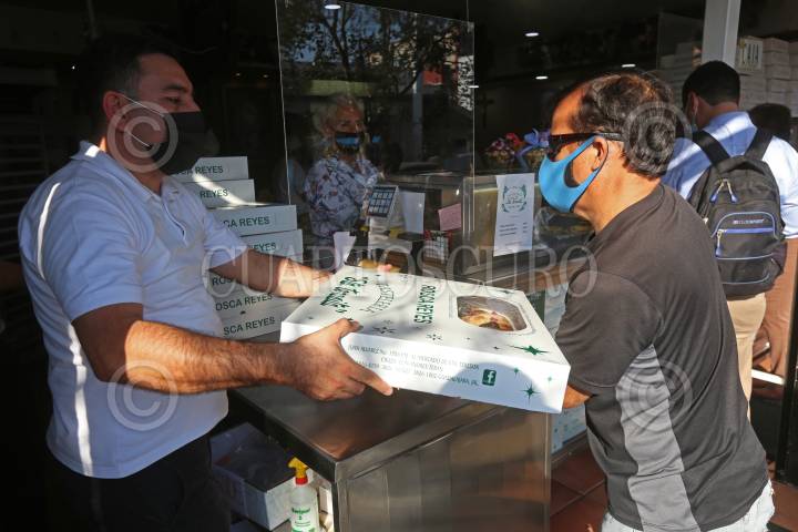 Un trabajador de la Pastelería Santa Teresita, hace entrega de una rosca de reyes a un cliente que acudió al establecimiento para adquirir su producto, esto en el marco del día de reyes.