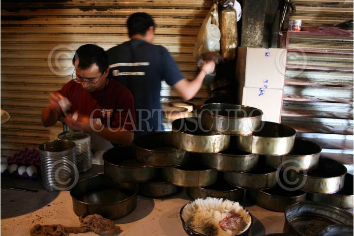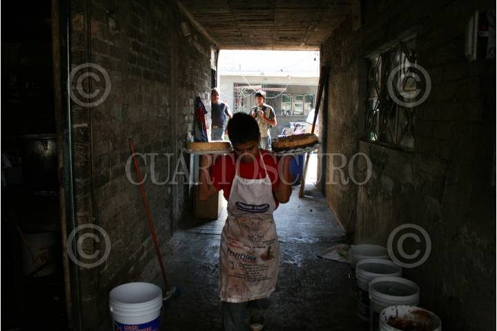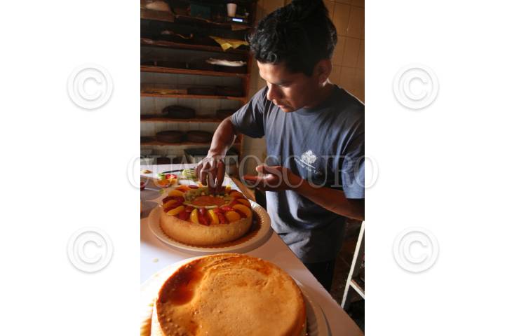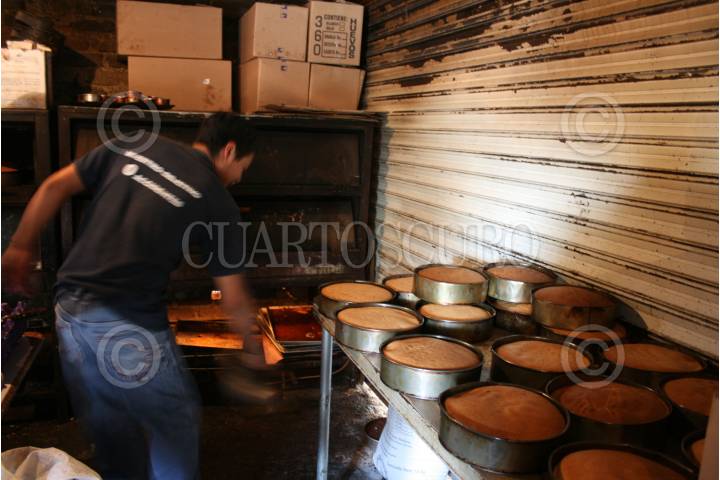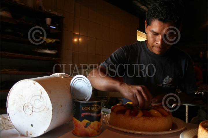 MÉXICO, D.F., 15DICIEMBRE2008.- Siempre que devoramos un pastel hasta la ultima migaja nos olvidamos del duro trabajo que se realiza día con día para su elaboración, desde muy temprano antes del que el sol salga, pasteleros preparan todo para hornear decorar y distribuir este dulce alimento, con frutas harina huevos y crema pastelera la gastronomía empieza a funcionar en este taller pastelero en el que trabajan 5 reposteros y la mascota como ellos denominan a un chalan que apenas cuenta con 16 años, ellos baten hornean y distribuyen los ricos pasteles que devoramos en cumpleaños y fiestas dentro de nuestros hogares. FOTO: RICARDO CASTELAN/CUARTOSCURO.COM