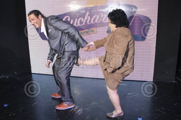 MÉXICO, D.F., 13JULIO2015.- Fabian Lavalle estrena su nuevo programa La Cuchara, un programa dedicado a las noticias del medio del espectáculo, en el canal de televisión World tv. Carmen Salinas acudió a la conferencia de prensa para dar la clásica patada de buena suerte a su compañero. FOTO: ISABEL MATEOS /CUARTOSCURO.COM