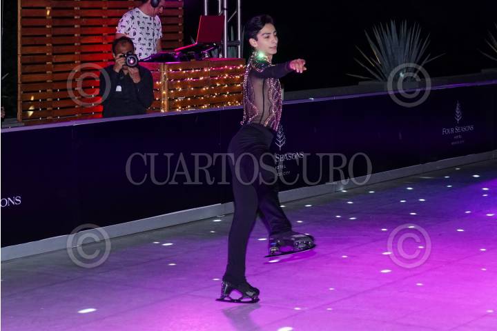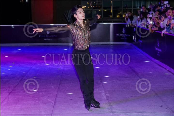 CIUDAD DE MÉXICO, 04DICIEMBRE2024.- El patinador olímpico Donovan Carrillo participó en el encendido del árbol navideño de la marca de paletas Magnum, celebrado en un hotel de la Ciudad de México. El joven se presentó brevemente con un número artístico en la pista de hielo que se instaló para las y los invitados. FOTO: GALO CAÑAS/CUARTOSCURO.COM