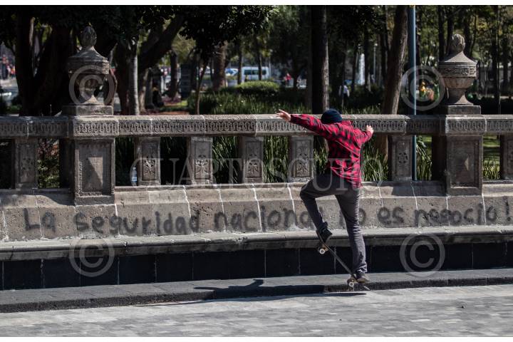 Pintas en las bancas de la Alameda central y jovenes practicando sk8te es una escena cotidiana en sus inmediaciones. La Alameda es uno de los lugares más concurridos por turistas y citadinos.