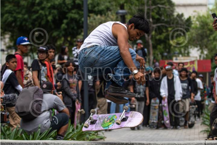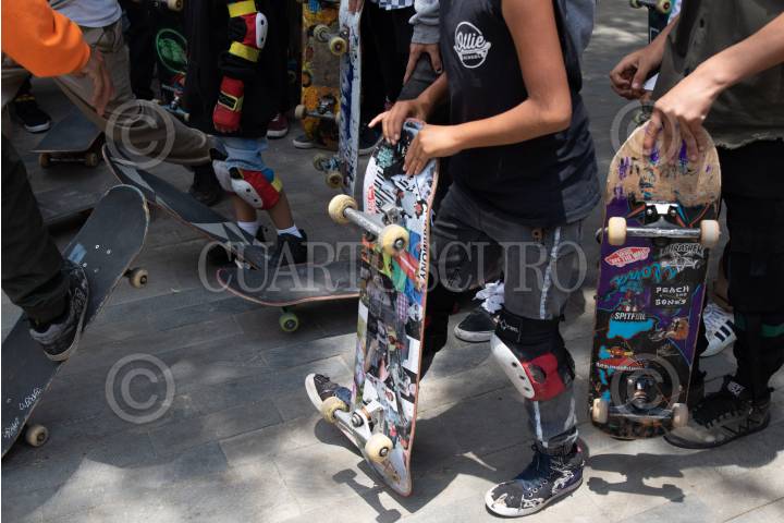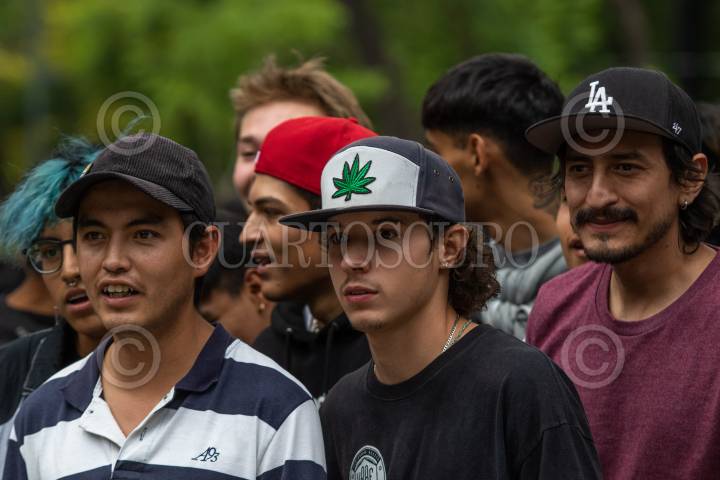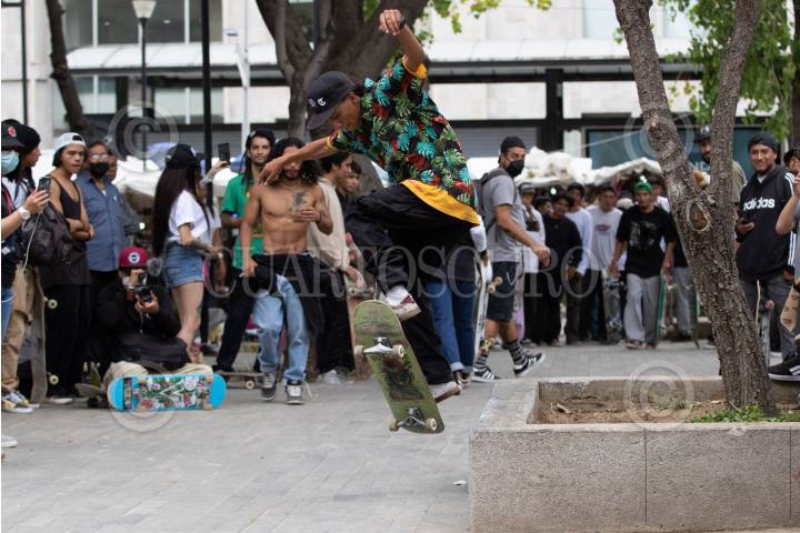 Chavos que practican el skateboard en la Alameda Central, en donde entre ellos muestran sus mejores movimientos.