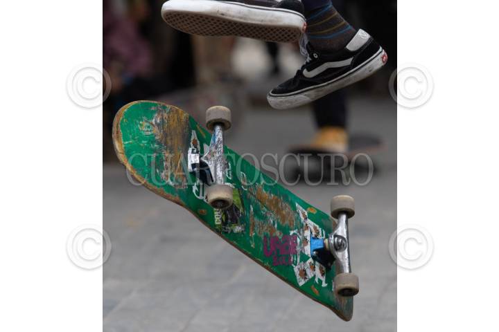 Un joven practica con su patineta en la Plaza de las Tres Culturas.