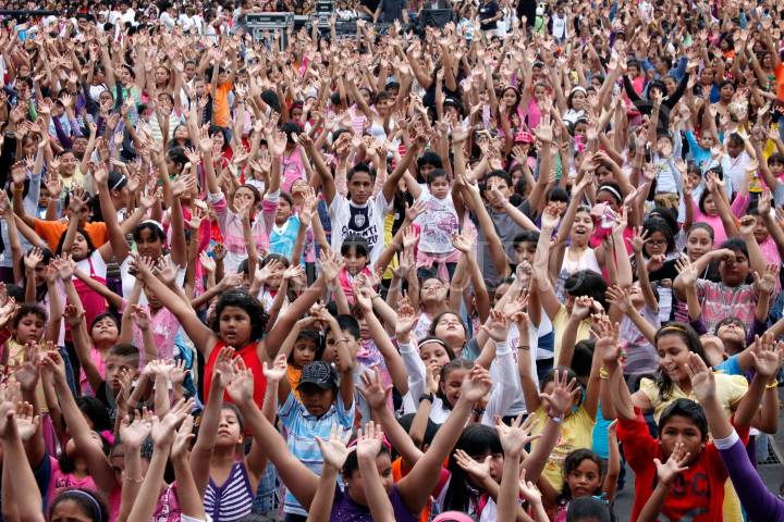VERACRUZ, VERACRUZ, 06MARZO2010.- Miles de niñas y niños ensayan la coreografía que presentaran mañana en el final en vivo de la telenovela “Atrévete a soñar” de Televisa, donde Danna Paola (patito) es la protagonista. Desde muy temprano los infantes acudieron a la cita en la Macro plaza del Malecón acompañados por sus papás. FOTO: FÉLIX MÁRQUEZ/CUARTOSCURO.COM