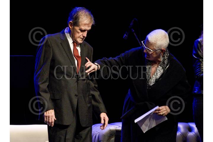 CIUDAD DE MÉXICO, 22OCTUBRE2019.- Héctor Bonilla, primer actor mexicano, fue homenajeado esta noche en el Teatro Esperanza Iris en donde la Ciudad de México, declara al actor como Patrimonio Cultural Vivo por sus 55 años de trayectoria artística. En la imagen, Sofía Álvarez, arregla el traje de su esposo Héctor Bonilla. FOTO: MARIO JASSO /CUARTOSCURO.COM