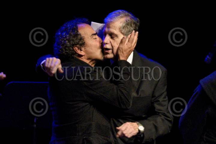 CIUDAD DE MÉXICO, 22OCTUBRE2019.- Héctor Bonilla, primer actor mexicano, fue homenajeado esta noche en el Teatro Esperanza Iris en donde la Ciudad de México, declara al actor como Patrimonio Cultural Vivo por sus 55 años de trayectoria artística. En la imagen, el actor Damián Alcázar, saluda y felicita al actor Héctor Bonilla. FOTO: MARIO JASSO /CUARTOSCURO.COM
