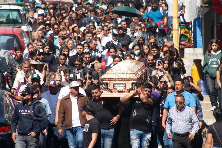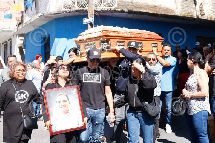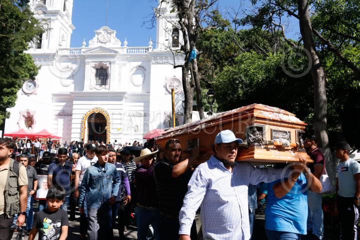 CHILPANCINGO, GUERRERO, 26DICIEMBRE2024.- Un cortejo fúnebre y un nulo dispositivo de seguridad fue la manera en que despidieron al presidente del Patronato de la Feria de San Mateo, Navidad y Año Nuevo Martín Roberto Ramírez Ruiz, quien fue asesinado el pasado 24 de diciembre en la plazoleta del Barrio de San Mateo. Con danzas de Tlacololeros, mariachi y solo 6 policías del estado, un contingente de vecinos, promotores culturales y familiares partieron al mediodía con dirección a la Iglesia del mismo barrio. Una vez que sus familiares lo despidieron en la capilla, el féretro fue llevado hasta la Junta de Conciliación Arbitraje, dónde laboraba, para ser despedido por sus compañeros de trabajo. Finalmente los restos fueron trasladado al panteón municipal para su sepultura, autoridades del ayuntamiento de Chilpancingo confirmaron que la feria no será suspendida, pese a que artistas y comerciantes decidieron retirarse tras el homicidio, mientras que los que decidieron quedarse tendrán resguardo de los tres niveles de gobierno. FOTO: DASSAEV TÉLLEZ ADAME/CUARTOSCURO.COM