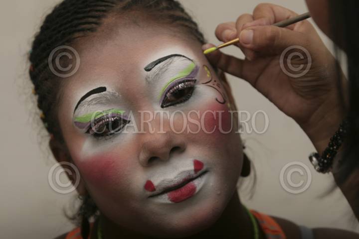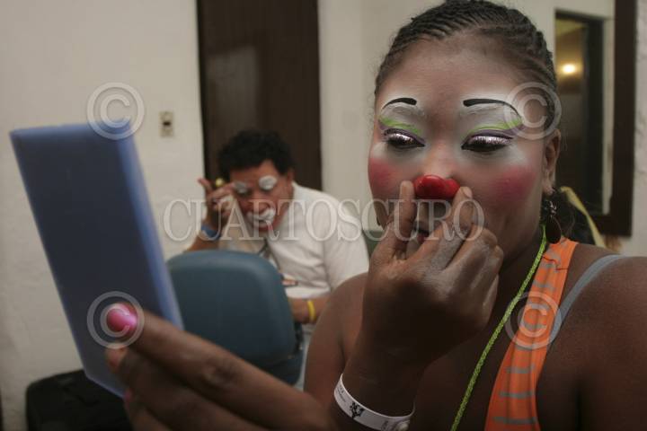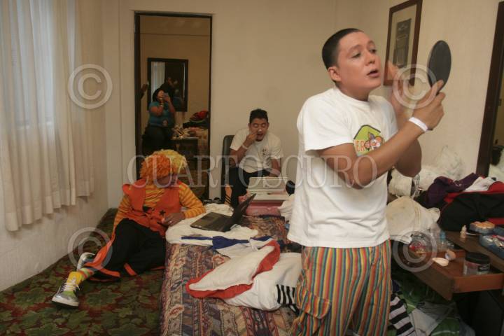 MÉXICO, D.F., 22OCTUBRE2012.- Payasos de la República del Salvador, Venezuela, Belize y otros países, así como de varios Estados de la República, agrupados en la "Hermandad de los Payasos", acudieron hoy a la inaguración de la Feria de la Risa, la cual tendrá actividades durante 3 días. Para ello se prepararon con horas de anterioridad en las habitaciones de sus hoteles maquillandose y afinando detalles de vestuario. En el acto inagural se pronunciaron en favor de la seguridad para sus compañeros, ya que han sido víctimas de la delincuencia. FOTO: JUAN PABLO ZAMORA /CUARTOSCURO.COM
