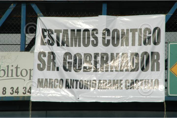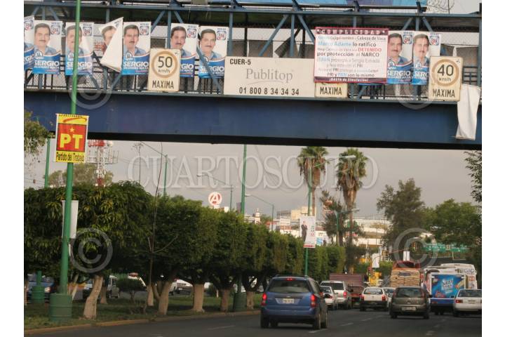 CUERNAVACA, MORELOS., 21MAYO2009.- La capital morelense amaneció tapizada de narco mantas colocadas en puentes peatonales de las principales avenidas de Cuernavaca, se colocaron dos tipos de mantas unas en apoyo al gobernador Marco Adame y otras en su contra resaltando su apoyo al ex secretario de seguridad pública Luis Ángel cabeza de Vaca que esta en arraigo por autoridades federales. FOTO: LUIS GIRON/CUARTOSCURO.COM
