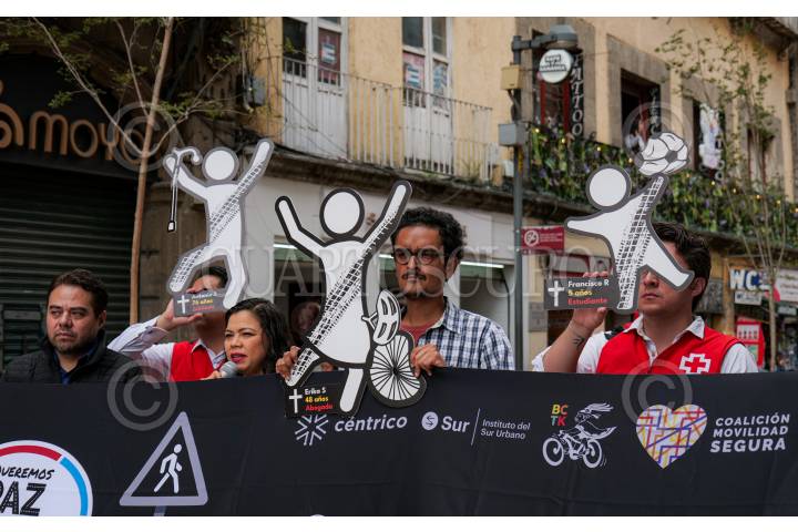 CIUDAD DE MÉXICO, 15AGOSTO2024.- Carlos Morales, integrante de la campaña de Seguridad Vehicular de El Poder del Consumidor; Alejandra Leal, co-directora de Céntrico y coordinadora nacional de la Coalición Movilidad Segura; y José Arévalo Lomelí, especialista en derecho público de SUR | Instituto del Sur Urbano, participaron a la protesta “¡No más muertes viales!”, en el marco del Día Mundial del Peatón. Las organizaciones presentes hicieron un llamado a las y los representantes del nuevo gobierno para que armonicen la Ley General de Movilidad y Seguridad Vial (LGMSV) con los instrumentos legales relacionados con la movilidad y la seguridad vial y vehicular. Durante el evento, los colectivos se agruparon con figuras blancas en mano de personas peatones, destacando entre ellas infantes y personas con movilidad limitada. Esta protesta se realizó en la Avenida Francisco I. Madero, una de las principales avenidas peatonales de la capital. FOTO: ALICE MORITZ/CUARTOSCURO.COM